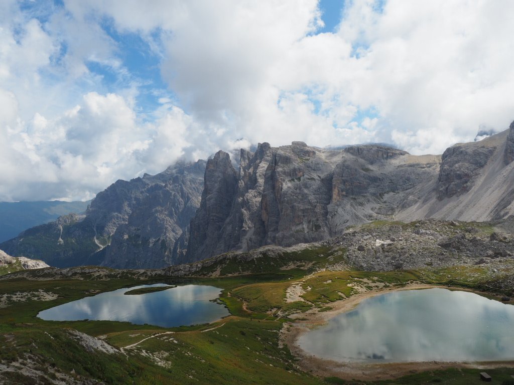 Die beiden Seen unterhalb der Drei-innen-Hütte Auf diesen Wegen pilgern die Massen von den Zinnen zur Hütte und zurück Auf der Südseite der Zinnen – Blick ins Tal Nach dem Trubel-Bereich begann ziemlich schnell der Steig Richtung Savio-Hütte. Uiuiui, da gab’s einige ausgesetzte Stellen mit schmalem Pfad, an denen ich mich ziemlich überwinden musste. Ne andere Nummer als der Karnische Höhenweg. Der Versuch, den Pfadverlauf zu fotografieren, ging bisher schief. Er ist einfach nicht zu erkennen. Auch vom Hüttenhügel der Savio aus bestimmen die Zinnen noch das Panorama.