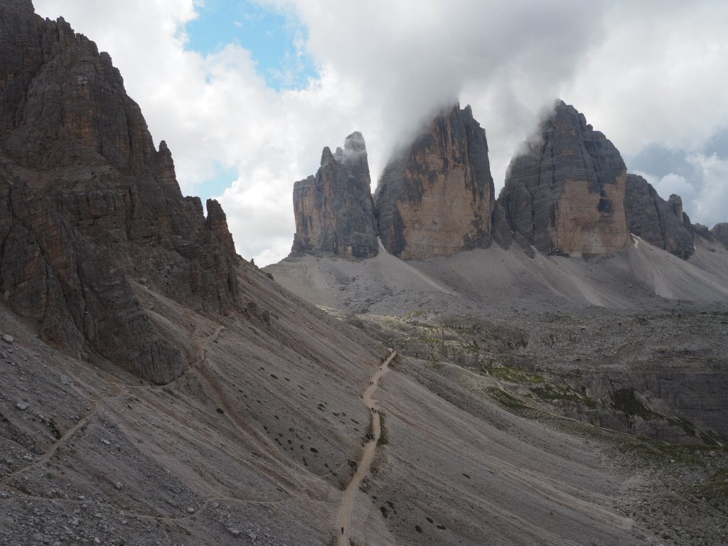 Nach einem Auto-Lift nach Sexten (danke, Karo und Julian) steigen wir stetig Richtung Drei Zinnen auf. Und wenn wir uns schon unterwegs über die vielen wandernden Menschen gewundert hatten, kam der echte Schock dann an der Drei-Zinnen-Hütte. Ausflügelnde Menschenmassen, vor allem von der anderen Seite, auf der man mit dem Auto bis zur Auronzohütte fahren kann.