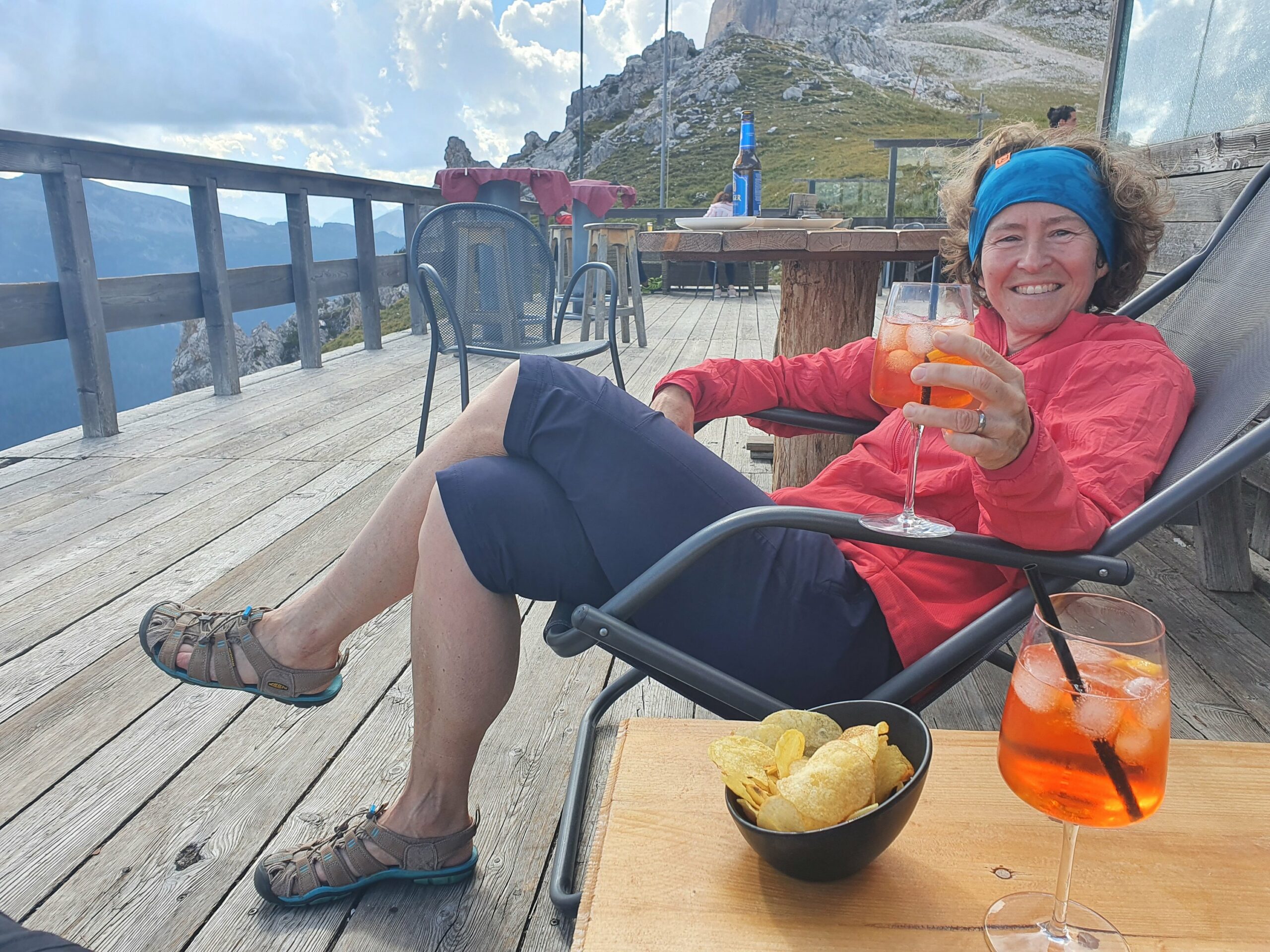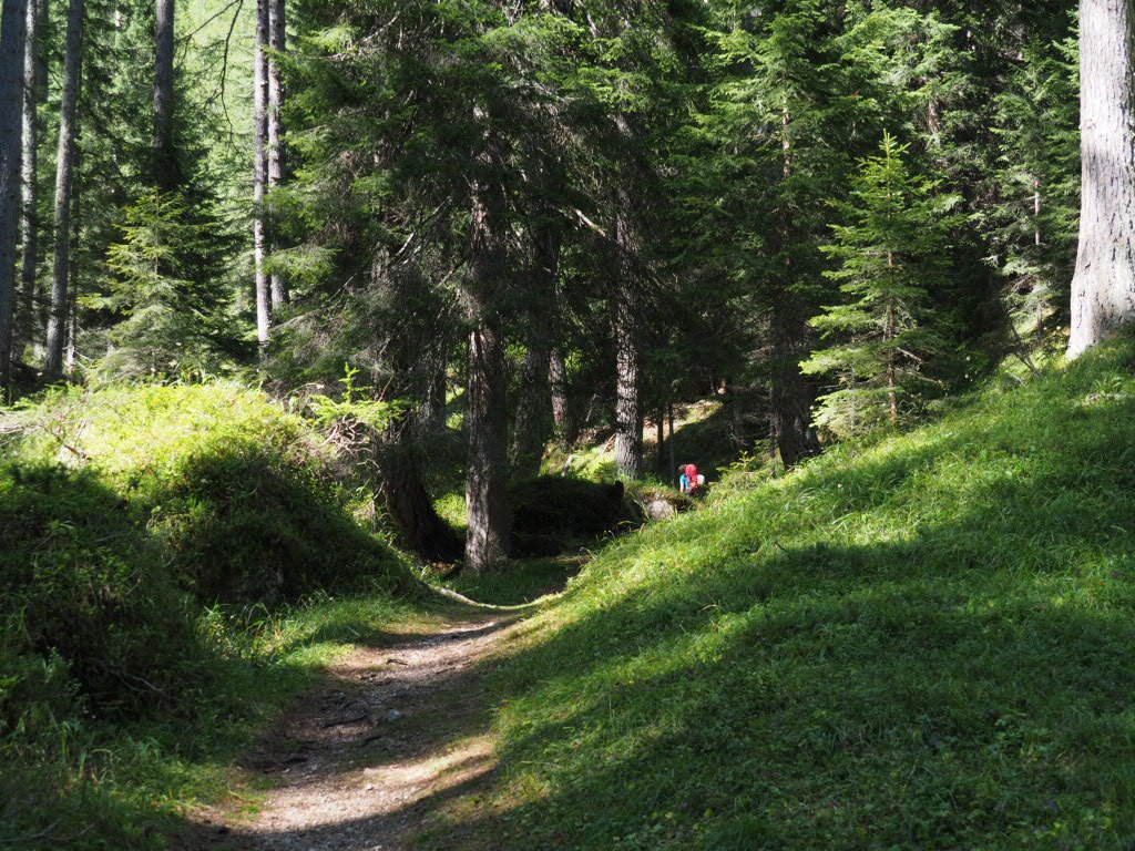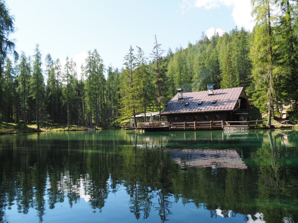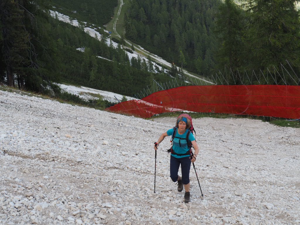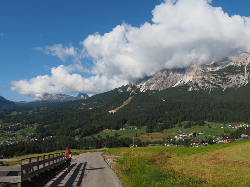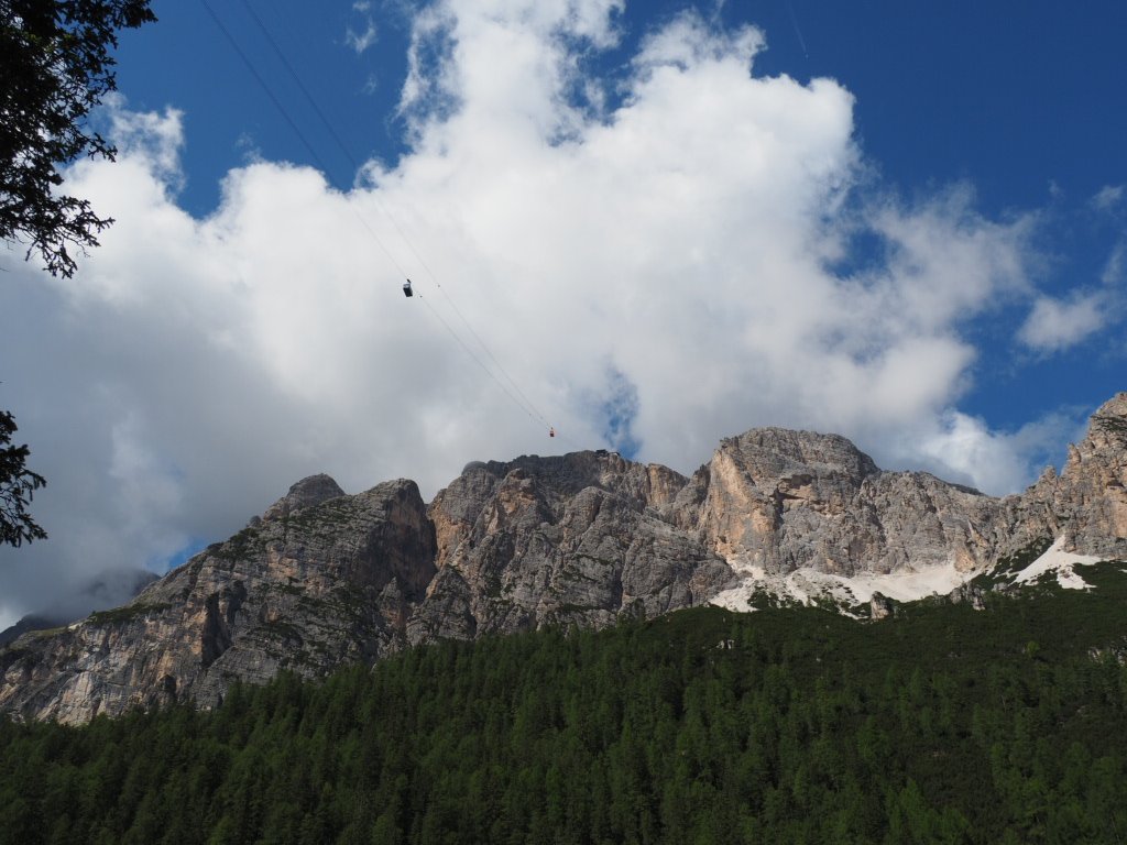 Auf breiten Spazierwegen hinab nach Cortina – vorbei an aufwändig herausgeputzten ehemaligen Bauernhöfen. Der wilde Torrente Boite – es hätte sogar Badebuchten gegeben. Uns war’s aber noch zu früh (zu kalt?) Ein unfassbar klarer Fischteich im Wald. Baden leider nicht möglich. Ein Paradies für Forellen und Karpfen. Wundervoller Wanderweg durch den üppig grünen Wald. Wer erkennt die Seilbahngondeln zur Tofana di Mezzo? Eindeutig ein Anwärter auf den Titel: „Besch… Weg des Alpenbogens“ – dafür unter Wintersportfans berühmt. Die Abfahrtsstrecke Tofana, 1956 für die Olympiade angelegt, auf der Toni Sailer damals gewann. Zum Aufstieg aber völlig ungeeignet, wie an Coras Gesichtsausdruck unschwer zu erkennen ist. Aber welch eine Belohnung auf der Terrasse des Rifugio Pomedes, das ebenfalls 1956 zur Olympiade gebaut wurde. Knapp oberhalb ist der Abfahrtsstart – auch heute noch im Weltcup im Einsatz. Wir können uns beide nicht erinnern, jemals so ein grandioses Panorama von einer Hüttenterrasse erlebt zu haben.
