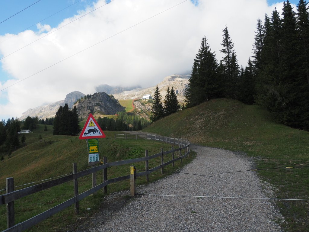 Nach dem Abstieg nach Corvara ging’s auf der anderen Seite an den fast 1500 Hm weiten Aufstieg, nicht ohne eindrückliche Warnung vor Mutterkühen (die aber jetzt kaum noch auf den Weiden anzutreffen sind)