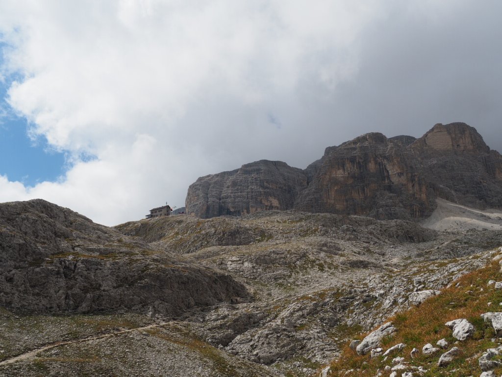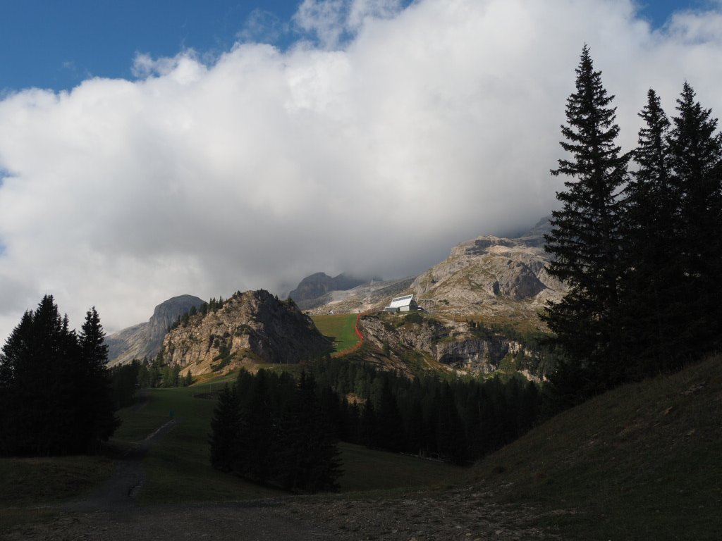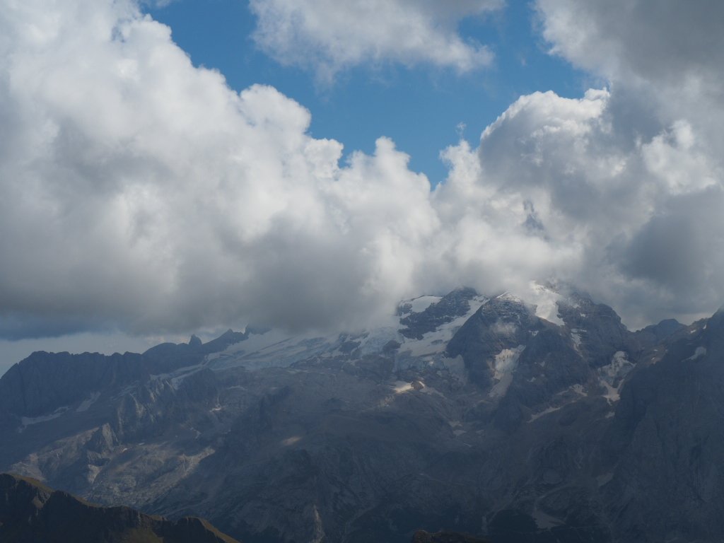 Auf Augenhöhe mit der Marmolada, die sich inzwischen einen Wolkenhut aufgesetzt hat und diesen auch für uns nicht lupfte.