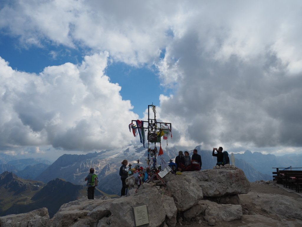 Ein bisschen schräg ist es schon auf diesem Gipfel: Das Kreuz mit Souveniers behängt, die Fassa-Hütte (!) und ein riesiges Irgendwas zum Senden, Empfangen oder wasweißich. Trotzdem: Tolles Gefühl auf diesem Summit of the Tour.