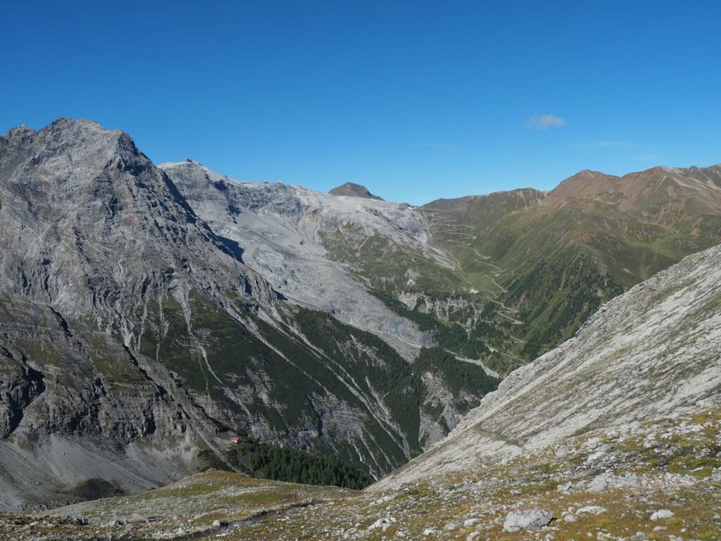Zunächst geht es zur Bärenscharte und dann über einen versicherten Steig (hab ein bisschen rumgeschissert, vor allem bei Gegenverkehr) in Richtung Julius-Payer-Hütte, dem Ausgangspunkt für den Normalweg. Tolle Blicke taten sich immer wieder auf zwischen den Felsen durch ins Tal. Aber vor allem kam der Ortler immer näher. Ich hatte niemals erwartet, dass ich da so nah dran komme und so einen guten Eindruck kriege. Die Konsequenzen musste ich gerade eben spüren: Ich hab dermaßen viel Fotos aus ähnlichen Blickwinkeln gemacht, dass es ziemlich schwierig war, das auf ein vernünftiges Maß zu reduzieren. Jetzt sind’s eigentlich gar nicht mehr so viele.