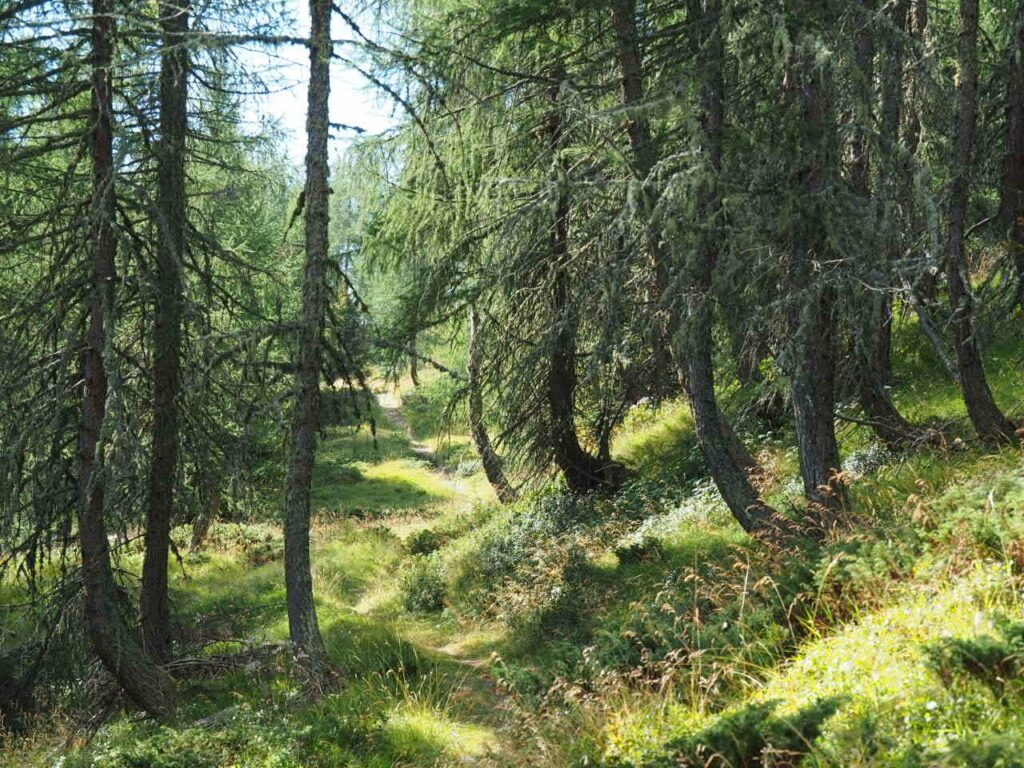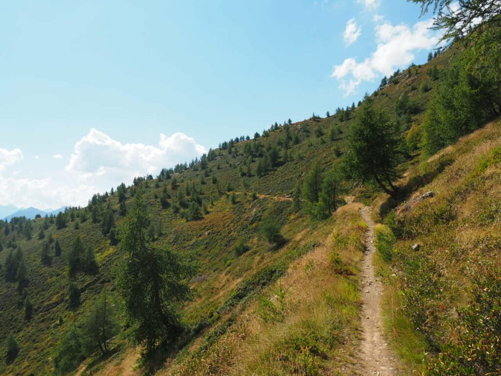 Die Route führte heute überwiegend auf bequemen, aber nicht langweiligen Pfaden am Hang entlang, immer so etwa auf 2000 m Höhe rum. Ab und zu ging es auch durch kühlende Wälder. Und immer hatte ich Blick ins Tal und in weiter entfernte höhere Massive. Für mich war es toll, noch einmal und wieder aus einer anderen Perspektive das Ortlermassiv zu sehen (an eurer Stelle würde mich das so langsam nerven) und gleichzeitig aufs Adamello zu schauen.