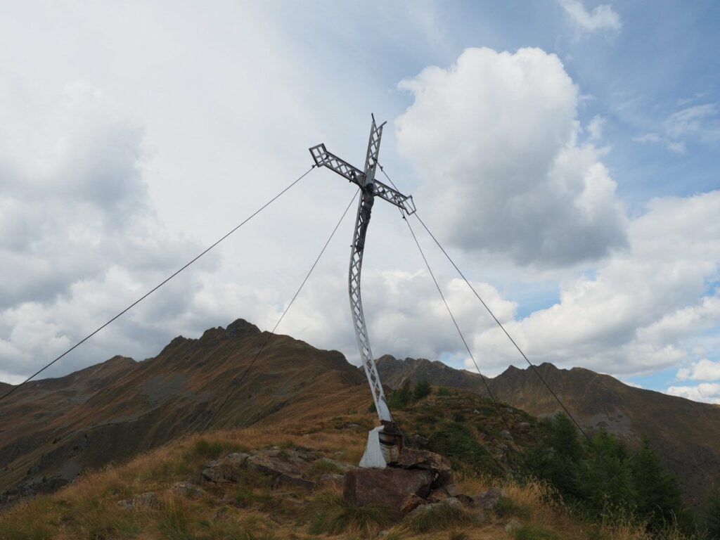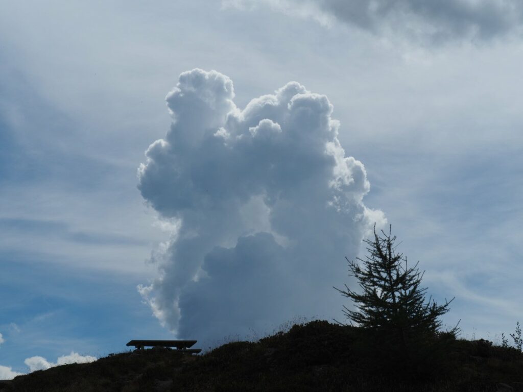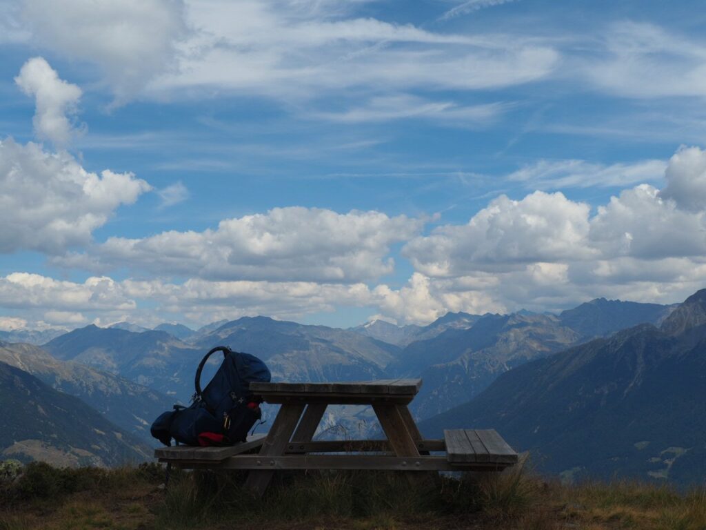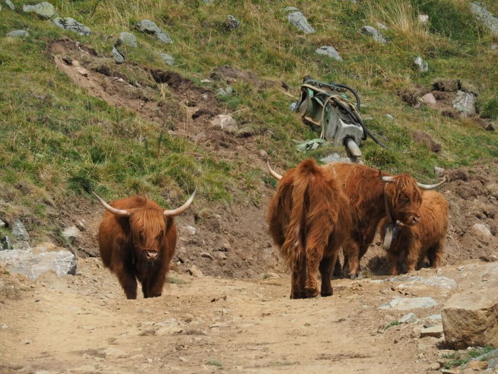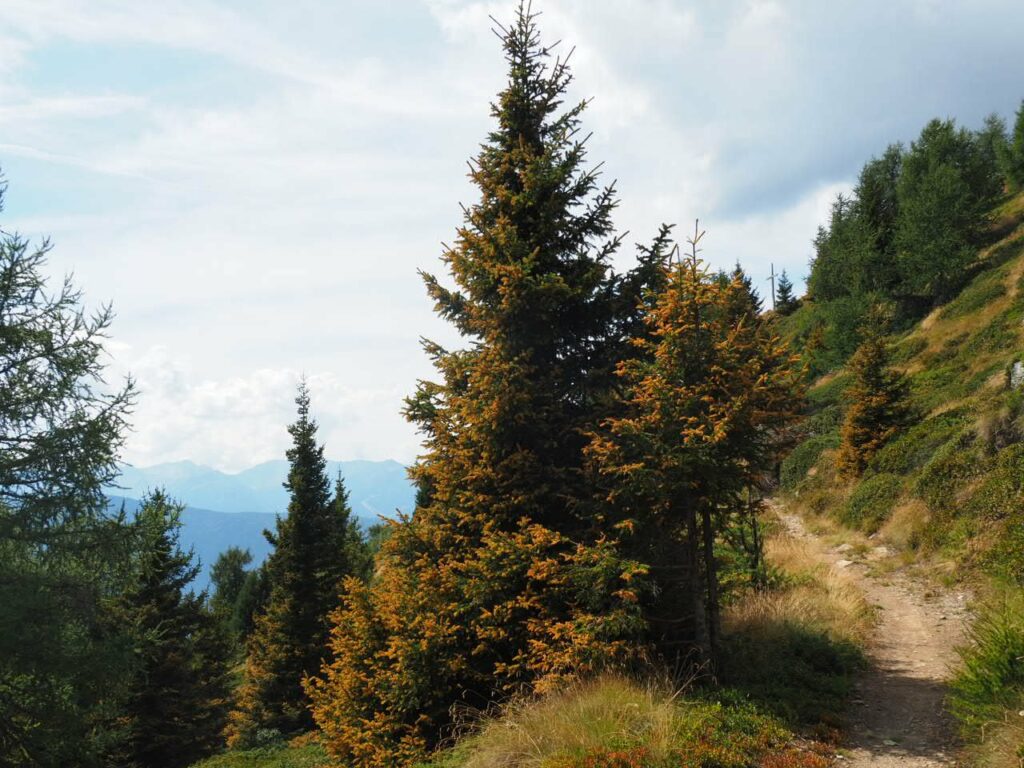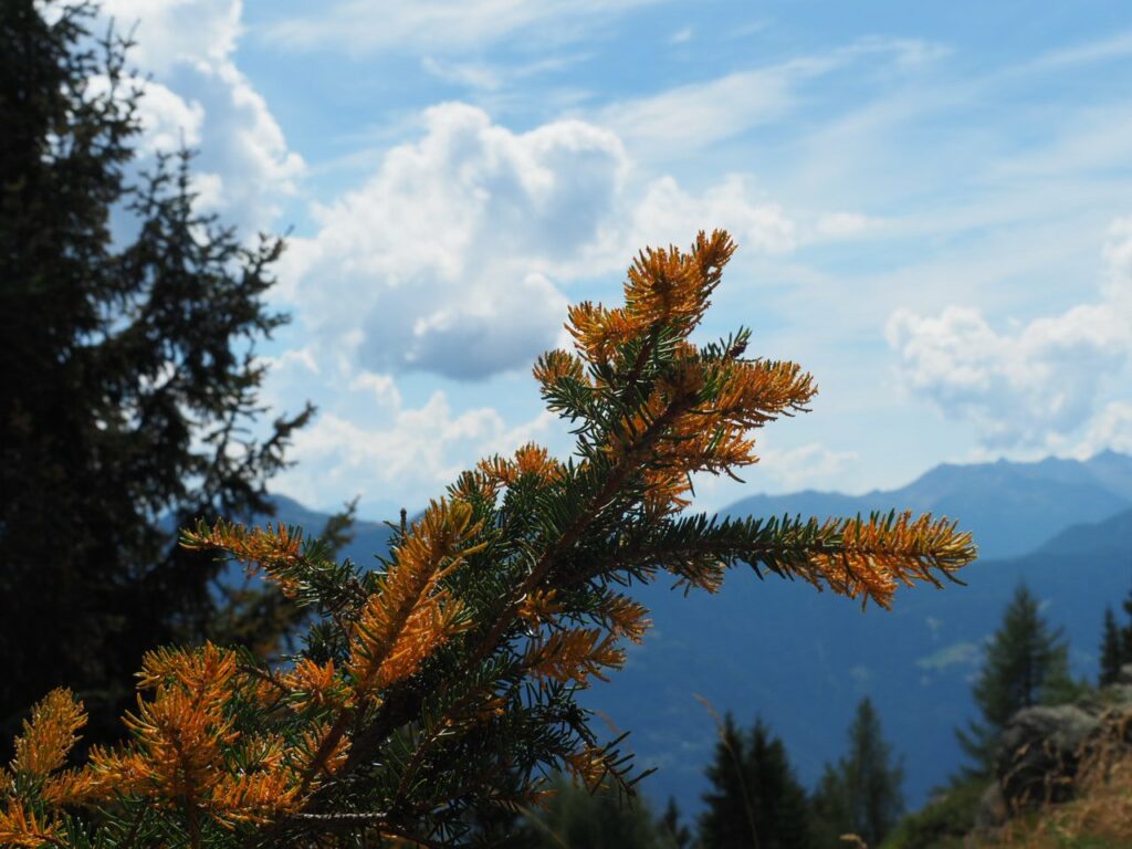 Das Rifugion Malghera, mein Startpunkt. So bequem ging’s oft entlang Sehr auffällig waren die leicht angegilbten Nadelbäume Aus der Nähe: Immer waren die Spitzen gelb. Wassermangel? Ab und zu durfte ich durch lichte und kühlende Waldstücke wandeln. Ganz typisch: Eine Alpe auf der Ebene vor dem Talschluss. Immer wunderbare Sicht ins Tal Vor denen war mir ein bisschen mulmig. Hochlandrinder mit vielen Jungen direkt auf meinem Weg. Erst bin ich vor Schreck in einen frischen Kuhfladen getreten und dann habe ich sie weit hangaufwärts umgangen. Warum nur fällt mir hier sofort Monty Python ein? Da baut sich was auf! Und war dann doch harmlos. So hatte ich einen traumhaften Abschluss-Ruheplatz kurz vor dem Tagesziel.