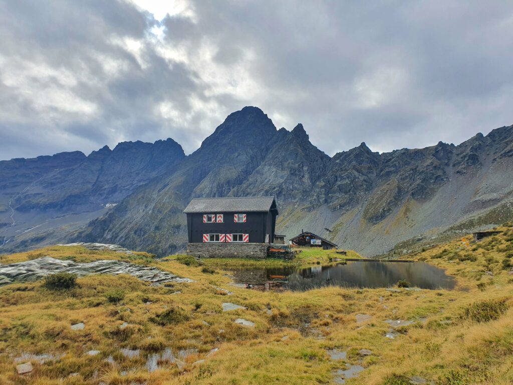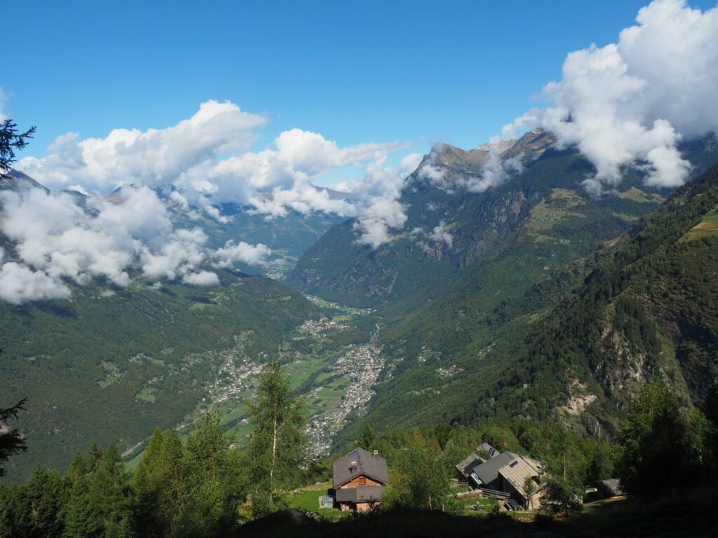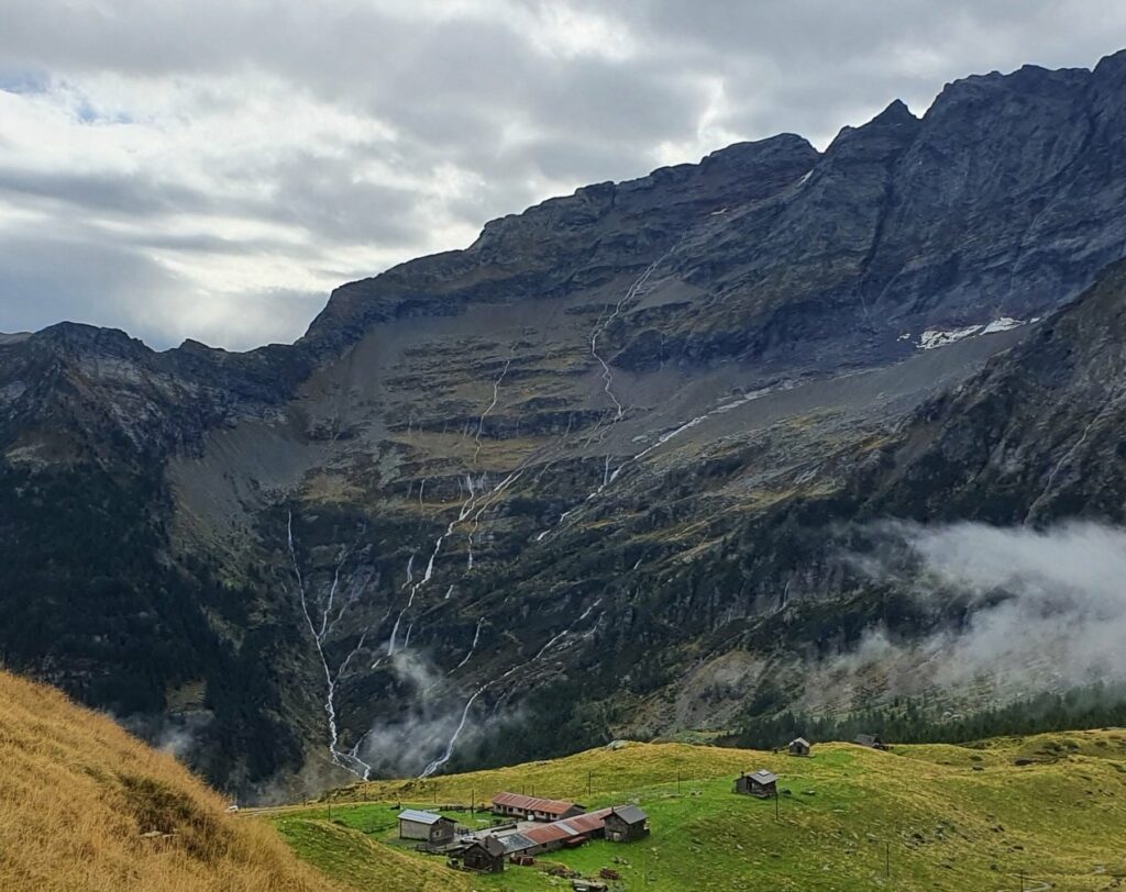 Gegen 10 macht es auf, unzählige Wasserfälle werden sichtbar, um die Hütte haben sich kleine Bäche und Seen gebildet. Ich wähle den etwas einfacheren Abstieg und hoffe, dass es keine unüberwindbaren Bachübergänge gibt. Immer wieder zeigen sich neue Perspektiven, angefangen vom Rheinwaldhorn (irgendwie hätte ich das in einer ganz anderen Richtung erwartet), natürlich ins Bleniotal, in die Leventina und auf die Tessiner Alpen, in die ich morgen gemeinsam mit Cora einsteige.
