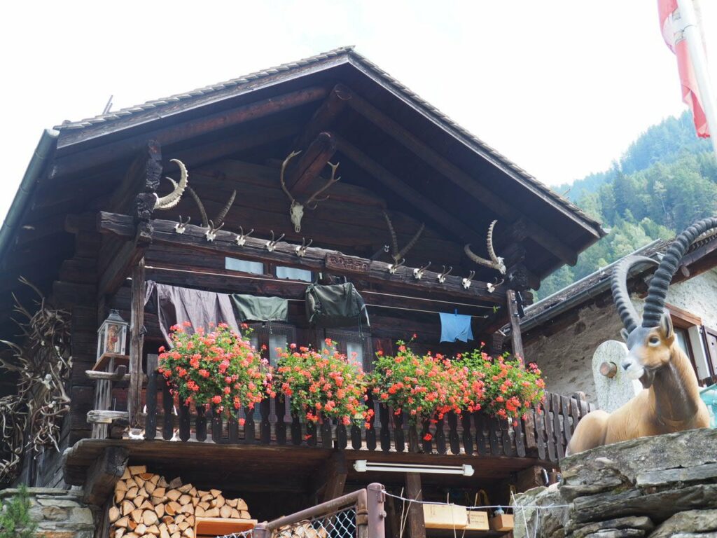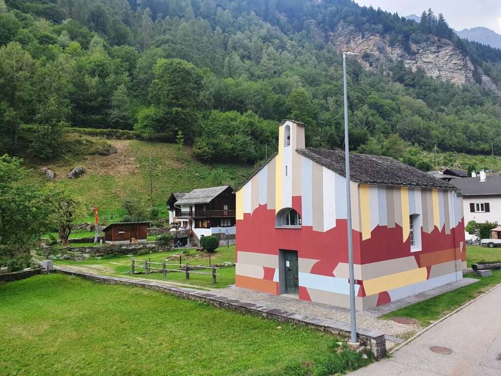 Meine aktuelle Unterkunft, die Albergo Valbella. Direkt nebendran: Die außen eigenwillg gestaltete Kapelle. Innen eher konventionell. Auch die beiden Hütten da oben haben dieses Design. Und auch sonst taucht es an einigen Ecken des Dorfes auf. Die Calancasca Das Dorfzentrum … mit einem der typischen Häuser. Von wegen Jagd und so.