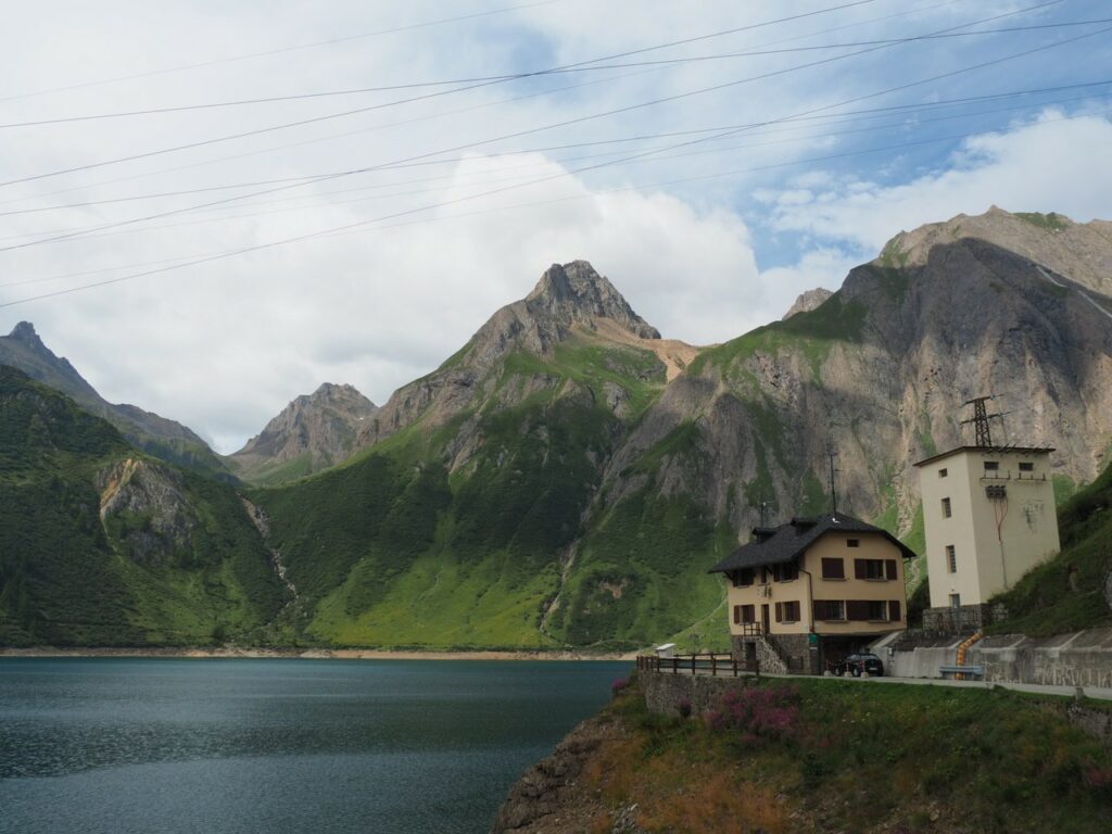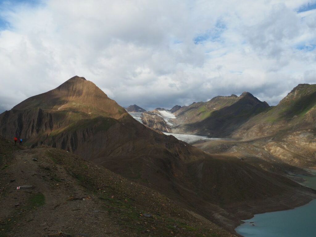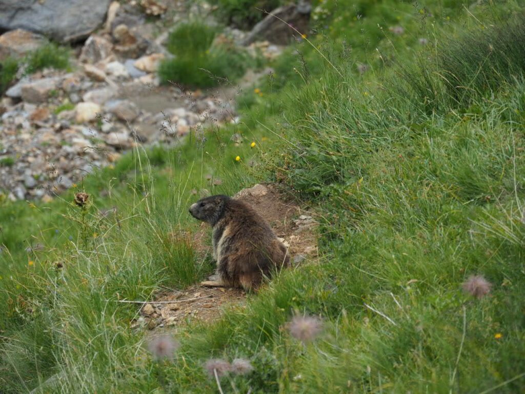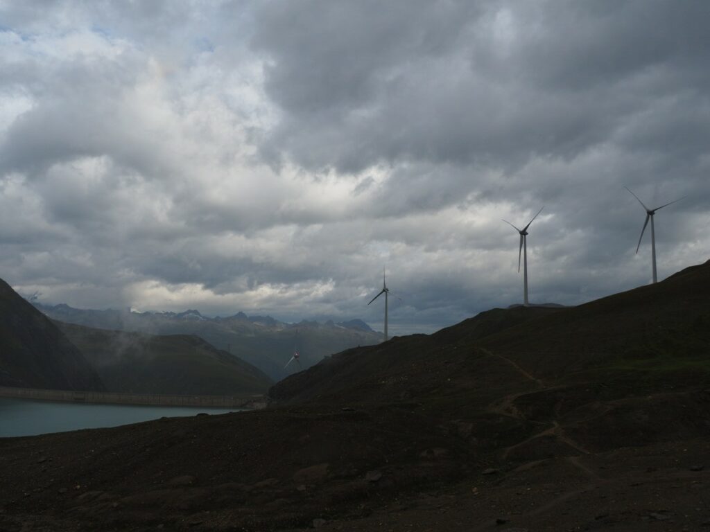 Heute gibt’s Wetter. Ein dauernder Sonne-Wolke-Mix, immer wieder treibt es Wolkenschwaden an uns vorbei.Und vor allem hat es Wind. Auf dem letzten Pass kommen wir kaum gegen die Düse an. Deshalb gibt es von da auch keine Bilder. Seltsamerweise stehen die gigantischen Windräder trotzdem still.Immer wieder sehen wir auf die inzwischen ziemlich geschrumpften Gletscher der umliegenden 3.000er. Seit vielen Jahren haben Cora und ich vor, diese Etappen bis ins Bintal oder zum Simplon mal als Skidurchquerung zu machen. Sie nennt sich Route de Soleil. Aber nie hat es geklappt. Ich muss sagen, im Sommer lohnt sich das auf jeden Fall auch.Gleich am Anfang bekommen wir einen leichten Regenguss ab, der aber der einzige des Tages bleibt. Weil wir der Sache nicht trauen, laufen wir halt doch noch ein Stückchen in Regenmontur.Wasser aus kleinen Schluchten …… und fröhlich durch die Almwiesen plätscherndUnd soooo viele Stauseen. An diesem hier kann ich es mit viel Geschick vermeiden, über eine Hängebrücke zu gehen.Auch unser Übernachtungsort, das Rifugio Margaroli, liegt an einem Stausee.Versuch, bei einer Pause ein wenig Windschutz zu bekommen..Entweder hat uns das Murmeli wegen Gegenwind nicht bemerkt oder es ist ihm egal.Links unten im Bild steht unsere Hütte.