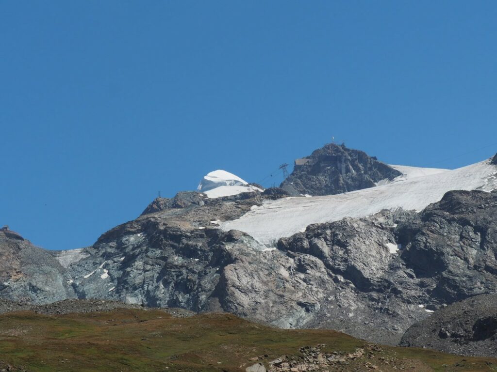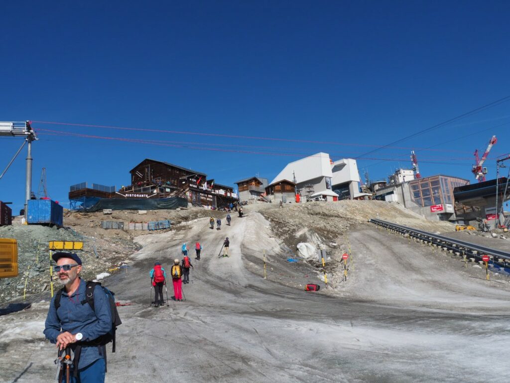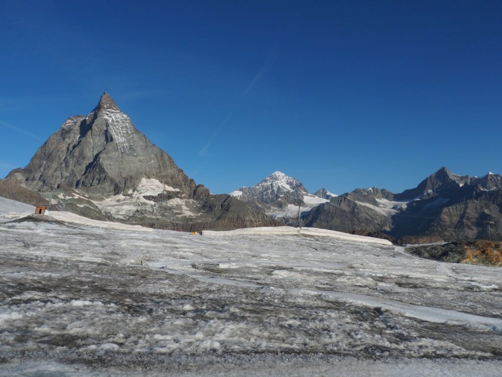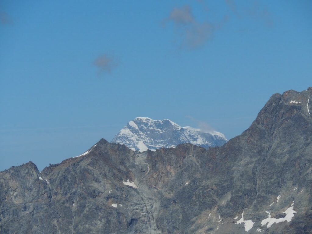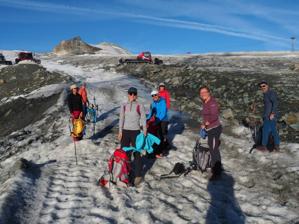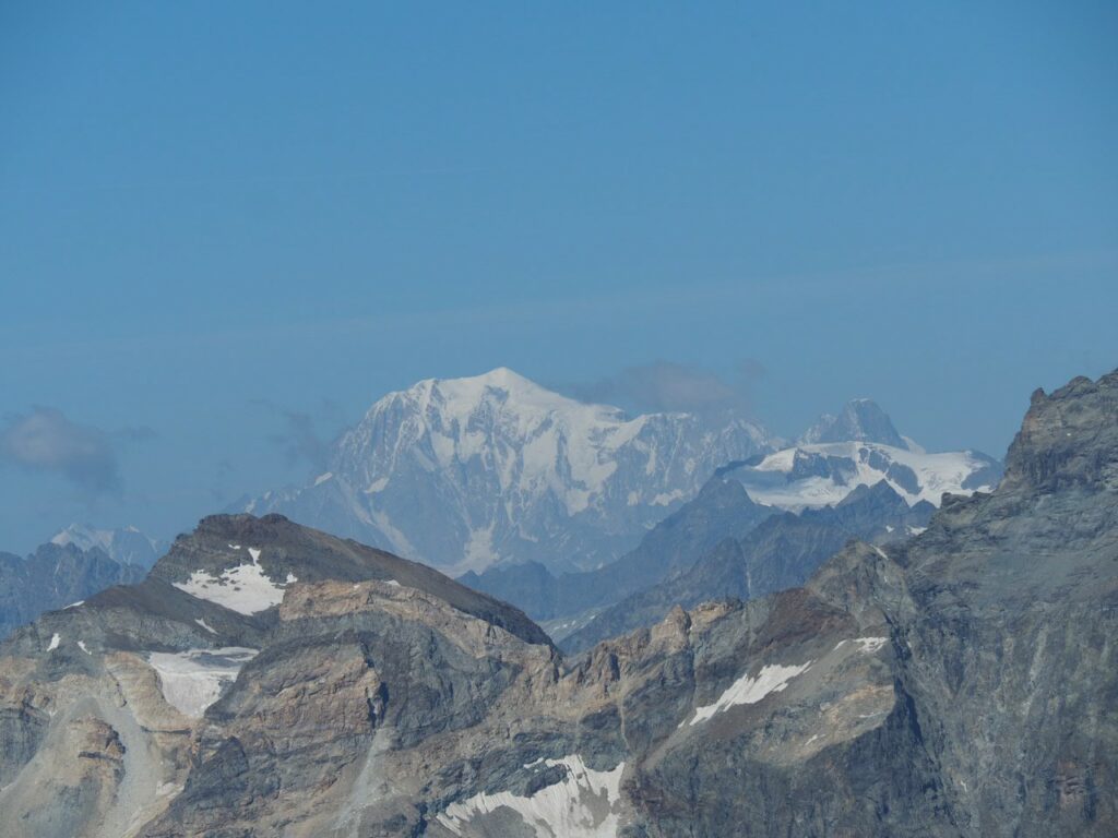 Breithorn in der MorgensonneNicht oft ist es möglich, auf einer Wanderung einen Gletscher zu überqueren. Hier am Theodul geht es, weil es keine Spalten auf der Route gibt und Pistenwalzen den Weg bereiten. Wie auf einer richtigen Hochtour schnallen wir die Zacken unter die Füße – in Form von Grödel.Neue Perspektive aufs MH.GletscherspaziergangNur, wenn man das Bild vergrößert, kann man ahnen, wie geschunden das Chli Matterhorn durch die Seilbahnen ist. Seit Juli diesen Jahres ist die Seilbahn-Verbindung zwischen Zermatt und Cervinia komplett. Jetzt ist also ein Shopping-Ausflug nach hüben oder drüben easy going. Puh…Rückblick in die Berner. Ich glaube, mit Jungfrau in der Mitte. Gunda hat soeben zugestimmt 😉Zack: Sommerskigebiet unterm Chli Matterhorn: Hier trainieren derzeit diverse Nationalmannschaften: Erkannt haben wir mindestens Österreich, Frankreich, Deutschland. Gunda meint auch, einen Abfahrtsstar erkannt zu haben. Von der Schlepperei mehrerer Paar Ski, Torstangen, Skischuhe, Bohrmaschinen für die Stangen durch Trainer und Skiläufer*innen habe ich keine Bilder gemacht. Aber es sieht nach harter Arbeit aus.Bei den Pistenraupen ist nicht immer so ganz klar, was sie da eigentlich machen.Schön ist anders, aber auch das ist Gebirgsrealität. Schließlich wird zur Zeit sogar auf den Onlinekarten vor den Pistenbauarbeiten gewarnt.Gran Paradiso – stimmt doch, Peter? Peter sagt: „JA“Nauf auf den Testa Grigia „Gipfel“ Nicht nur Profis sind unter den Skilaufenden. Besonders irritierend: Privatskilehrer tragen die Ski ihrer Kund*innen zur Seilbahnstation. (Wollte ich lieber nicht fotografieren)Erster Blick auf die Südseite Richtung Cervinia.Und was ist jetzt das wieder? Ja, Mensch, das ist doch der Moment, in dem wir den Titel der Tour im Blick haben: Da hinten ist der Mont Blanc!!! (Komisches Gefühl, das jetzt eine Woche später direkt unterhalb des MB vor der JuHe von Chamonix zu schreiben – zur Info: Ich hole gerade beim Schreiben auf …)Dent d’Herens? Gunda meint: Eher der Dent Blanche.Bei besserer Auflösung würde man da hinten die Karawane aufs Breithorn erkennen. Mit dem Fernglas haben wir’s gesehen. Morgens mit den Bahnen nauf aufs Chli Matterhorn, dann gschwind num aufs Breithorn und dann am Stammtisch vom ersten selbst bestiegenen 4.000er erzählen. So, Schluss mit ätzenden Sprüchen, denn eigentlich fasziniert mich das alles und ich sauge alle widersprüchlichen Eindrücke gierig in mich auf.… denn kommt schon wieder Idylle: Der erste (!) Bergbadesee des Jahres- gar nicht mal sooo kalt – Grödel und Mütze trocknen vor sich hin, während die Gruppe ein Mittagsnickerchen hält.Da unten liegt Cervinia.Unsere Unterkunft La Luge. So ein schön hergerichtetes Haus mit so schönen Zimmern und natürlich mit Matterhornblick. Das Resturant hat leider geschlossen, aber wir werden trotzdem verwöhnt. Nein, ich krieg kein Geld für diese Werbung. Es ist oifach schee.VeschberEin anderer Blick auf die MH Fahne. Hier also wird die Wolke produziert.