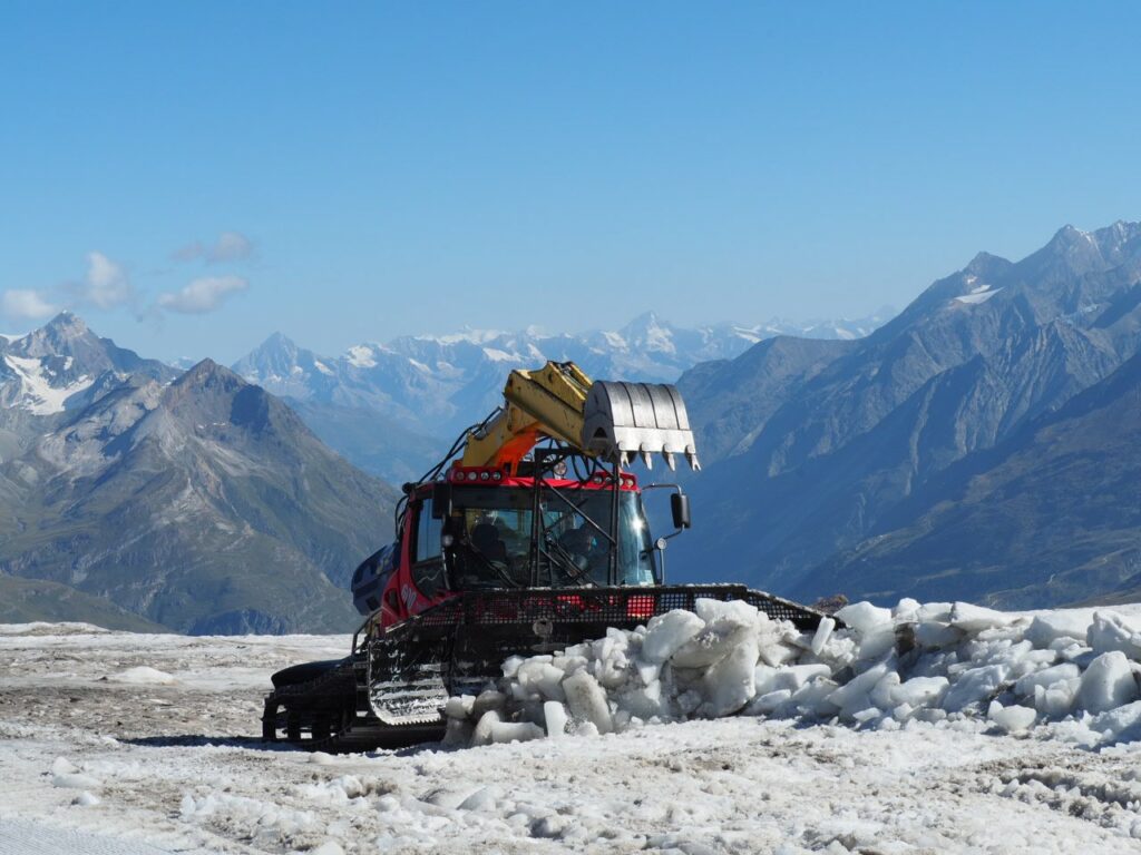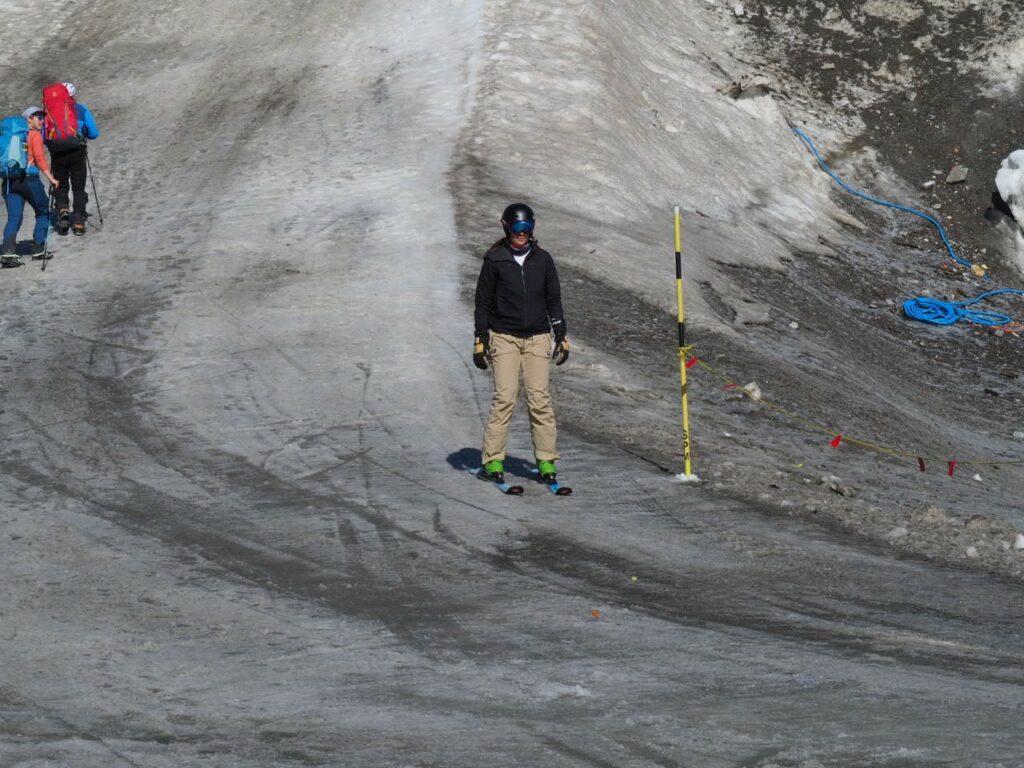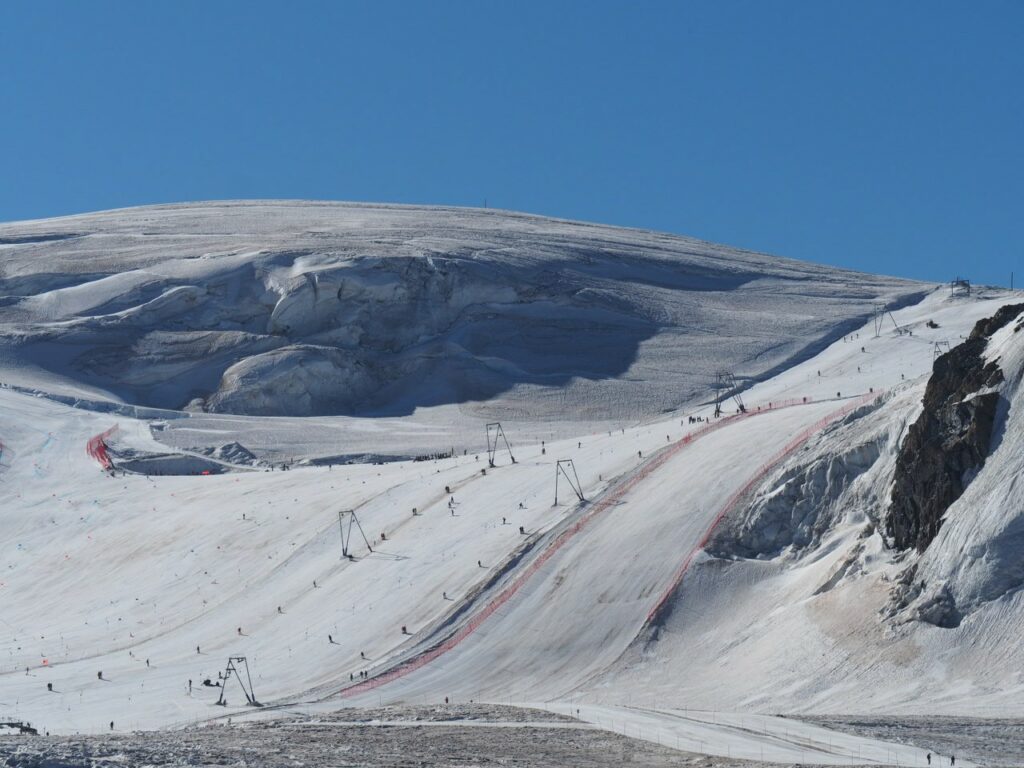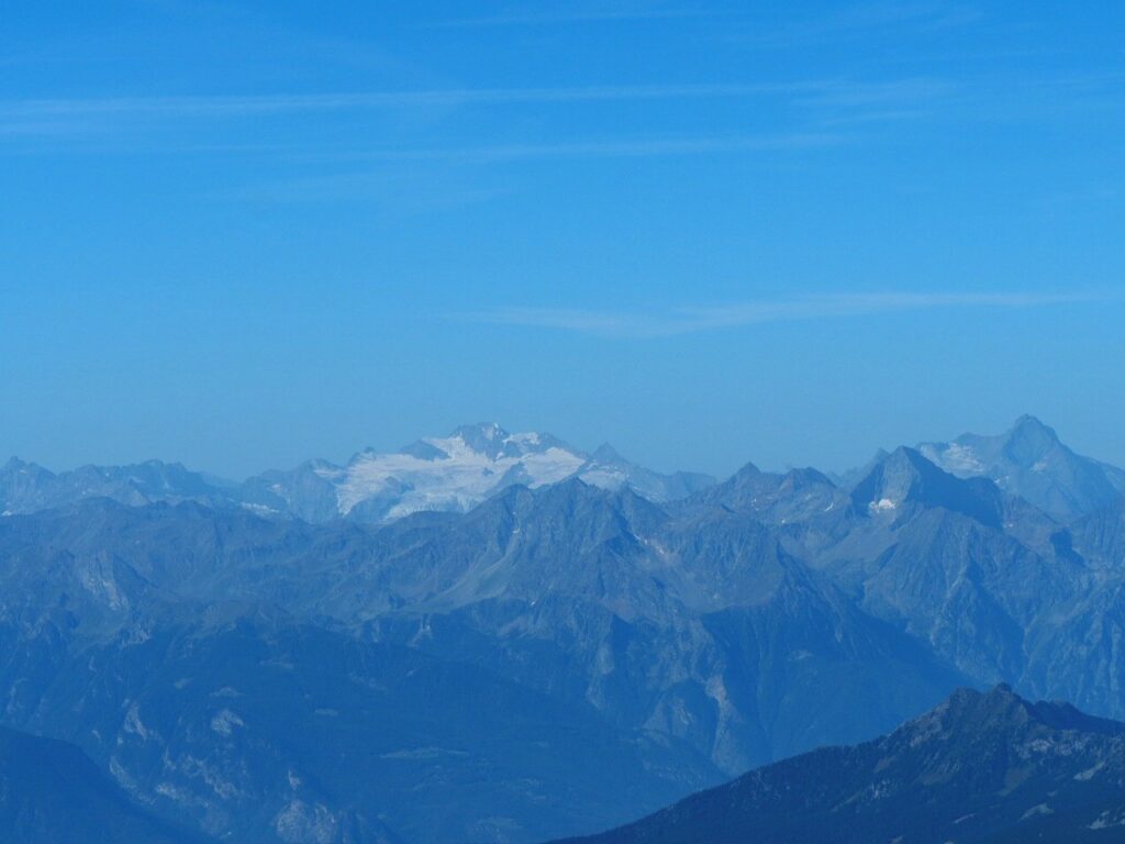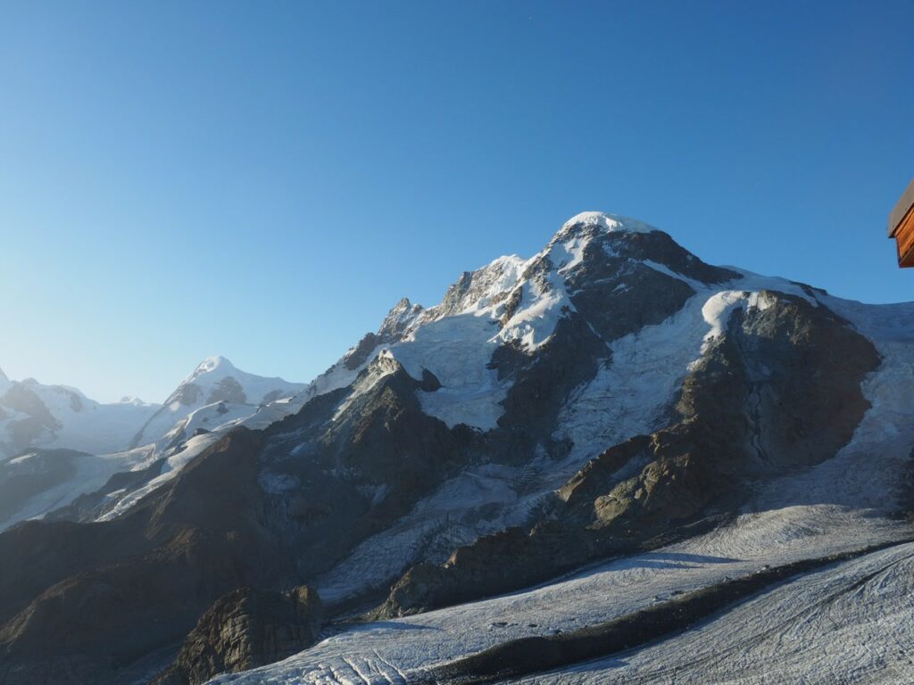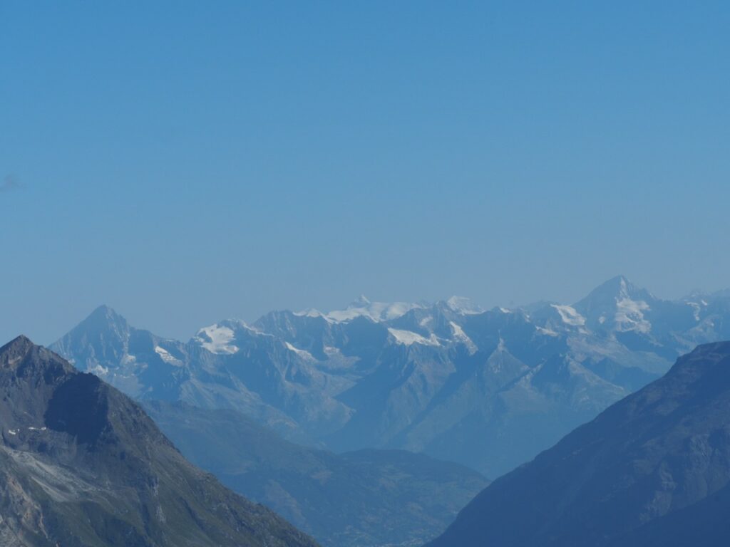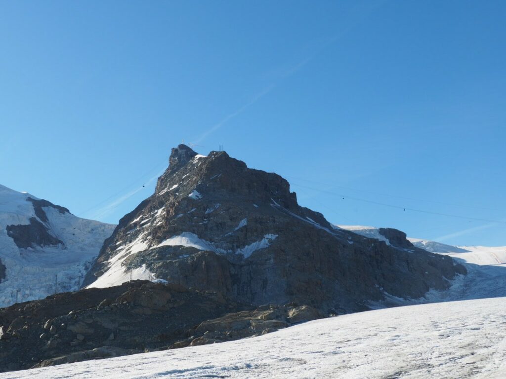 Breithorn in der MorgensonneNicht oft ist es möglich, auf einer Wanderung einen Gletscher zu überqueren. Hier am Theodul geht es, weil es keine Spalten auf der Route gibt und Pistenwalzen den Weg bereiten. Wie auf einer richtigen Hochtour schnallen wir die Zacken unter die Füße – in Form von Grödel.Neue Perspektive aufs MH.GletscherspaziergangNur, wenn man das Bild vergrößert, kann man ahnen, wie geschunden das Chli Matterhorn durch die Seilbahnen ist. Seit Juli diesen Jahres ist die Seilbahn-Verbindung zwischen Zermatt und Cervinia komplett. Jetzt ist also ein Shopping-Ausflug nach hüben oder drüben easy going. Puh…Rückblick in die Berner. Ich glaube, mit Jungfrau in der Mitte. Gunda hat soeben zugestimmt 😉Zack: Sommerskigebiet unterm Chli Matterhorn: Hier trainieren derzeit diverse Nationalmannschaften: Erkannt haben wir mindestens Österreich, Frankreich, Deutschland. Gunda meint auch, einen Abfahrtsstar erkannt zu haben. Von der Schlepperei mehrerer Paar Ski, Torstangen, Skischuhe, Bohrmaschinen für die Stangen durch Trainer und Skiläufer*innen habe ich keine Bilder gemacht. Aber es sieht nach harter Arbeit aus.Bei den Pistenraupen ist nicht immer so ganz klar, was sie da eigentlich machen.Schön ist anders, aber auch das ist Gebirgsrealität. Schließlich wird zur Zeit sogar auf den Onlinekarten vor den Pistenbauarbeiten gewarnt.Gran Paradiso – stimmt doch, Peter? Peter sagt: „JA“Nauf auf den Testa Grigia „Gipfel“ Nicht nur Profis sind unter den Skilaufenden. Besonders irritierend: Privatskilehrer tragen die Ski ihrer Kund*innen zur Seilbahnstation. (Wollte ich lieber nicht fotografieren)Erster Blick auf die Südseite Richtung Cervinia.Und was ist jetzt das wieder? Ja, Mensch, das ist doch der Moment, in dem wir den Titel der Tour im Blick haben: Da hinten ist der Mont Blanc!!! (Komisches Gefühl, das jetzt eine Woche später direkt unterhalb des MB vor der JuHe von Chamonix zu schreiben – zur Info: Ich hole gerade beim Schreiben auf …)Dent d’Herens? Gunda meint: Eher der Dent Blanche.Bei besserer Auflösung würde man da hinten die Karawane aufs Breithorn erkennen. Mit dem Fernglas haben wir’s gesehen. Morgens mit den Bahnen nauf aufs Chli Matterhorn, dann gschwind num aufs Breithorn und dann am Stammtisch vom ersten selbst bestiegenen 4.000er erzählen. So, Schluss mit ätzenden Sprüchen, denn eigentlich fasziniert mich das alles und ich sauge alle widersprüchlichen Eindrücke gierig in mich auf.… denn kommt schon wieder Idylle: Der erste (!) Bergbadesee des Jahres- gar nicht mal sooo kalt – Grödel und Mütze trocknen vor sich hin, während die Gruppe ein Mittagsnickerchen hält.Da unten liegt Cervinia.Unsere Unterkunft La Luge. So ein schön hergerichtetes Haus mit so schönen Zimmern und natürlich mit Matterhornblick. Das Resturant hat leider geschlossen, aber wir werden trotzdem verwöhnt. Nein, ich krieg kein Geld für diese Werbung. Es ist oifach schee.VeschberEin anderer Blick auf die MH Fahne. Hier also wird die Wolke produziert.