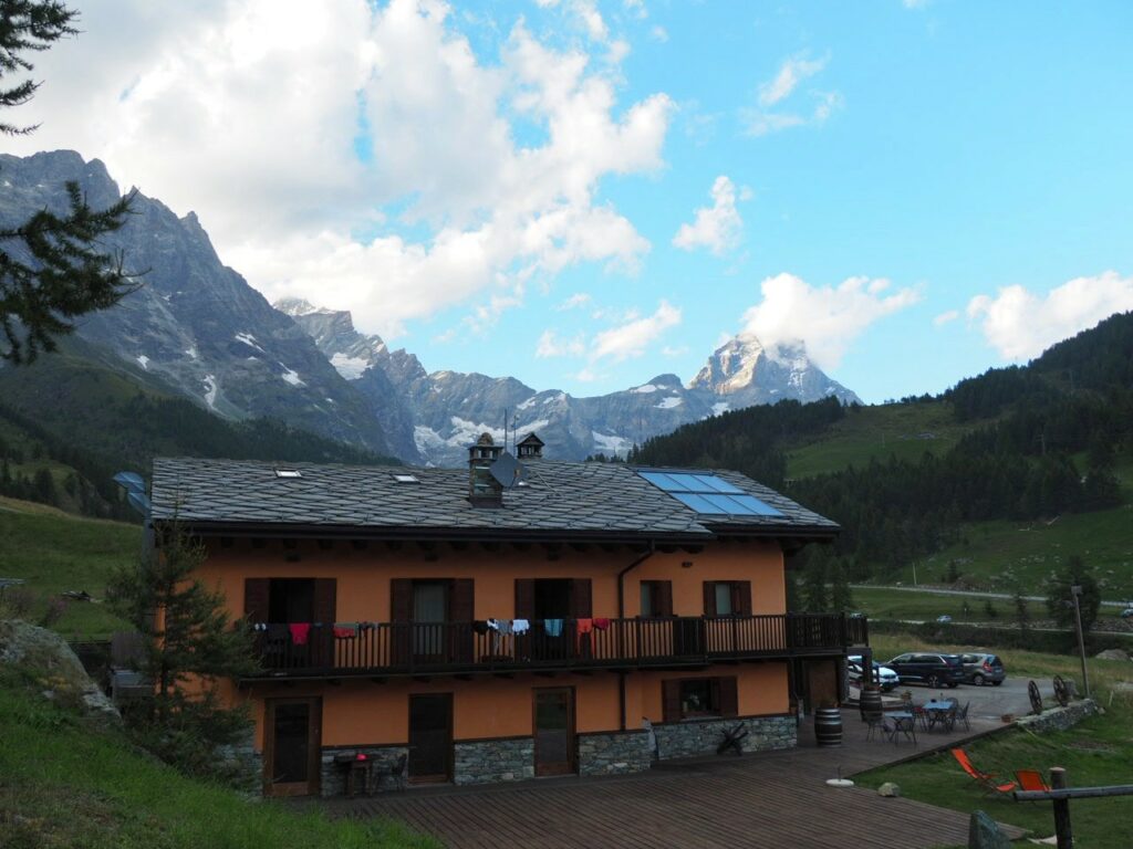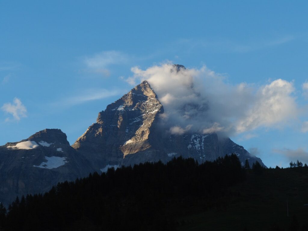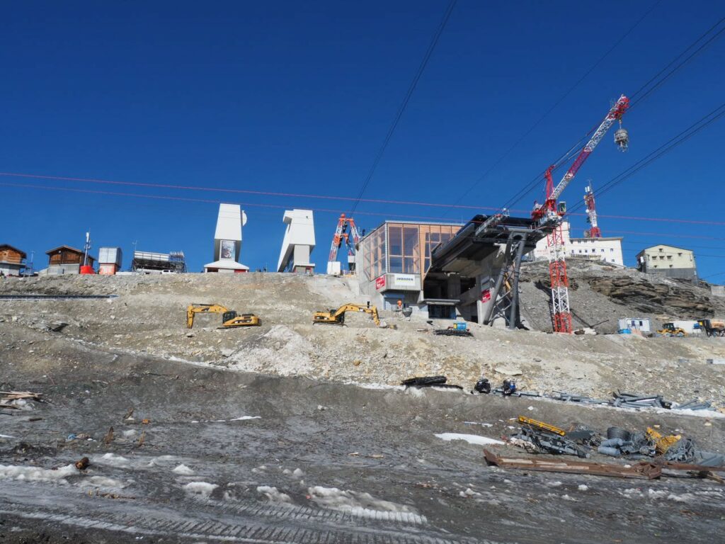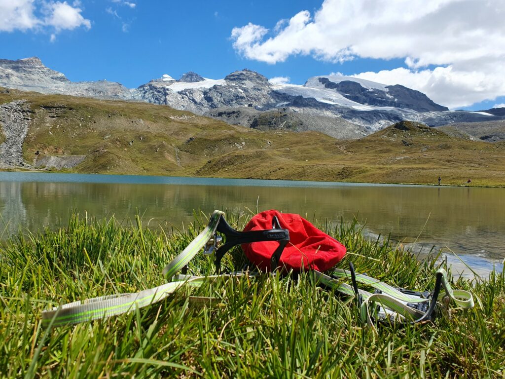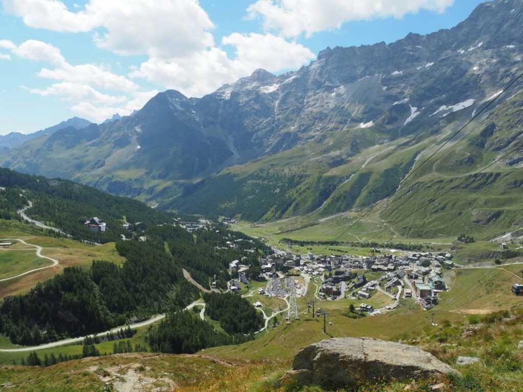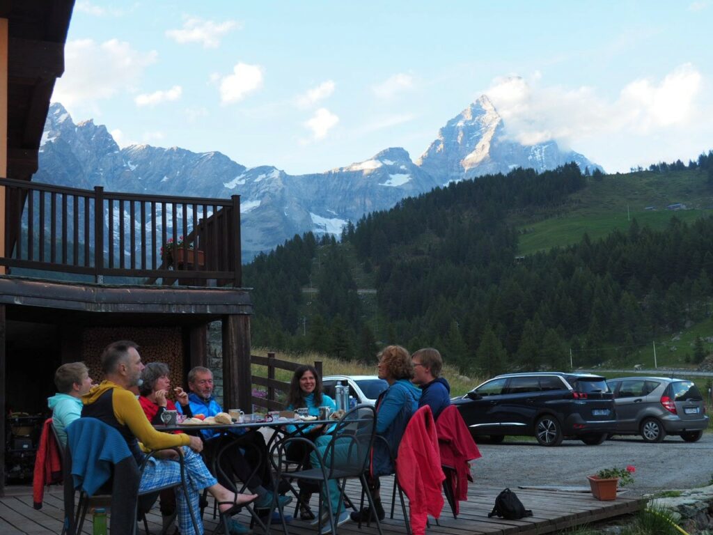 Breithorn in der MorgensonneNicht oft ist es möglich, auf einer Wanderung einen Gletscher zu überqueren. Hier am Theodul geht es, weil es keine Spalten auf der Route gibt und Pistenwalzen den Weg bereiten. Wie auf einer richtigen Hochtour schnallen wir die Zacken unter die Füße – in Form von Grödel.Neue Perspektive aufs MH.GletscherspaziergangNur, wenn man das Bild vergrößert, kann man ahnen, wie geschunden das Chli Matterhorn durch die Seilbahnen ist. Seit Juli diesen Jahres ist die Seilbahn-Verbindung zwischen Zermatt und Cervinia komplett. Jetzt ist also ein Shopping-Ausflug nach hüben oder drüben easy going. Puh…Rückblick in die Berner. Ich glaube, mit Jungfrau in der Mitte. Gunda hat soeben zugestimmt 😉Zack: Sommerskigebiet unterm Chli Matterhorn: Hier trainieren derzeit diverse Nationalmannschaften: Erkannt haben wir mindestens Österreich, Frankreich, Deutschland. Gunda meint auch, einen Abfahrtsstar erkannt zu haben. Von der Schlepperei mehrerer Paar Ski, Torstangen, Skischuhe, Bohrmaschinen für die Stangen durch Trainer und Skiläufer*innen habe ich keine Bilder gemacht. Aber es sieht nach harter Arbeit aus.Bei den Pistenraupen ist nicht immer so ganz klar, was sie da eigentlich machen.Schön ist anders, aber auch das ist Gebirgsrealität. Schließlich wird zur Zeit sogar auf den Onlinekarten vor den Pistenbauarbeiten gewarnt.Gran Paradiso – stimmt doch, Peter? Peter sagt: „JA“Nauf auf den Testa Grigia „Gipfel“ Nicht nur Profis sind unter den Skilaufenden. Besonders irritierend: Privatskilehrer tragen die Ski ihrer Kund*innen zur Seilbahnstation. (Wollte ich lieber nicht fotografieren)Erster Blick auf die Südseite Richtung Cervinia.Und was ist jetzt das wieder? Ja, Mensch, das ist doch der Moment, in dem wir den Titel der Tour im Blick haben: Da hinten ist der Mont Blanc!!! (Komisches Gefühl, das jetzt eine Woche später direkt unterhalb des MB vor der JuHe von Chamonix zu schreiben – zur Info: Ich hole gerade beim Schreiben auf …)Dent d’Herens? Gunda meint: Eher der Dent Blanche.Bei besserer Auflösung würde man da hinten die Karawane aufs Breithorn erkennen. Mit dem Fernglas haben wir’s gesehen. Morgens mit den Bahnen nauf aufs Chli Matterhorn, dann gschwind num aufs Breithorn und dann am Stammtisch vom ersten selbst bestiegenen 4.000er erzählen. So, Schluss mit ätzenden Sprüchen, denn eigentlich fasziniert mich das alles und ich sauge alle widersprüchlichen Eindrücke gierig in mich auf.… denn kommt schon wieder Idylle: Der erste (!) Bergbadesee des Jahres- gar nicht mal sooo kalt – Grödel und Mütze trocknen vor sich hin, während die Gruppe ein Mittagsnickerchen hält.Da unten liegt Cervinia.Unsere Unterkunft La Luge. So ein schön hergerichtetes Haus mit so schönen Zimmern und natürlich mit Matterhornblick. Das Resturant hat leider geschlossen, aber wir werden trotzdem verwöhnt. Nein, ich krieg kein Geld für diese Werbung. Es ist oifach schee.VeschberEin anderer Blick auf die MH Fahne. Hier also wird die Wolke produziert.