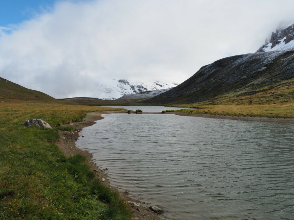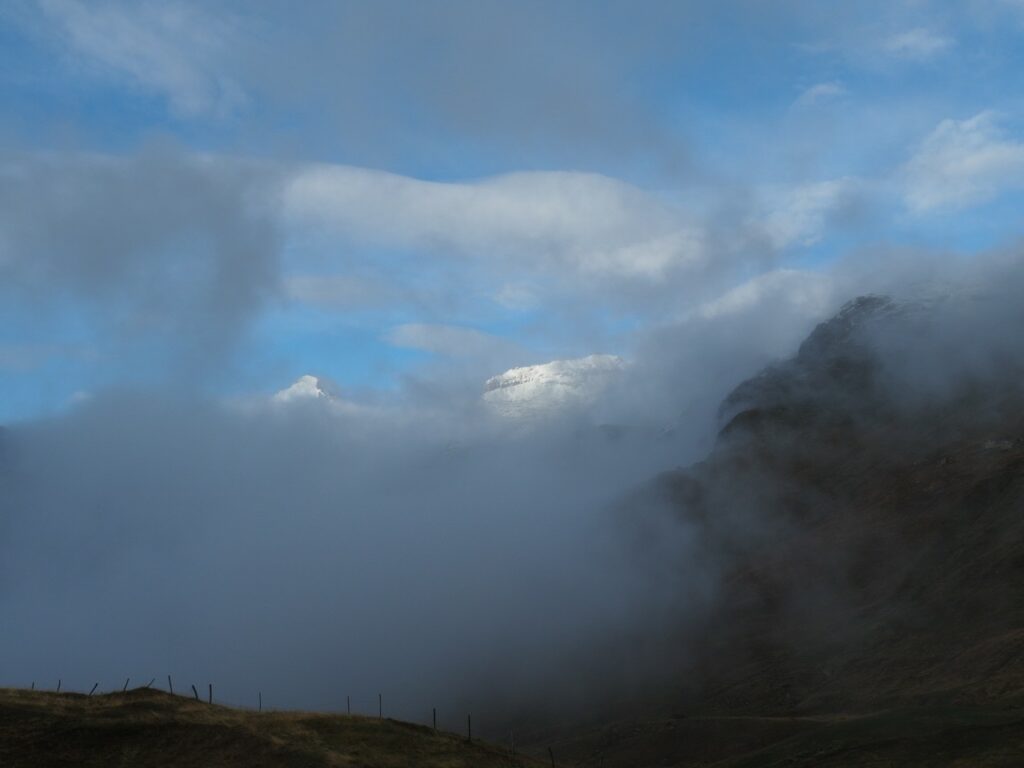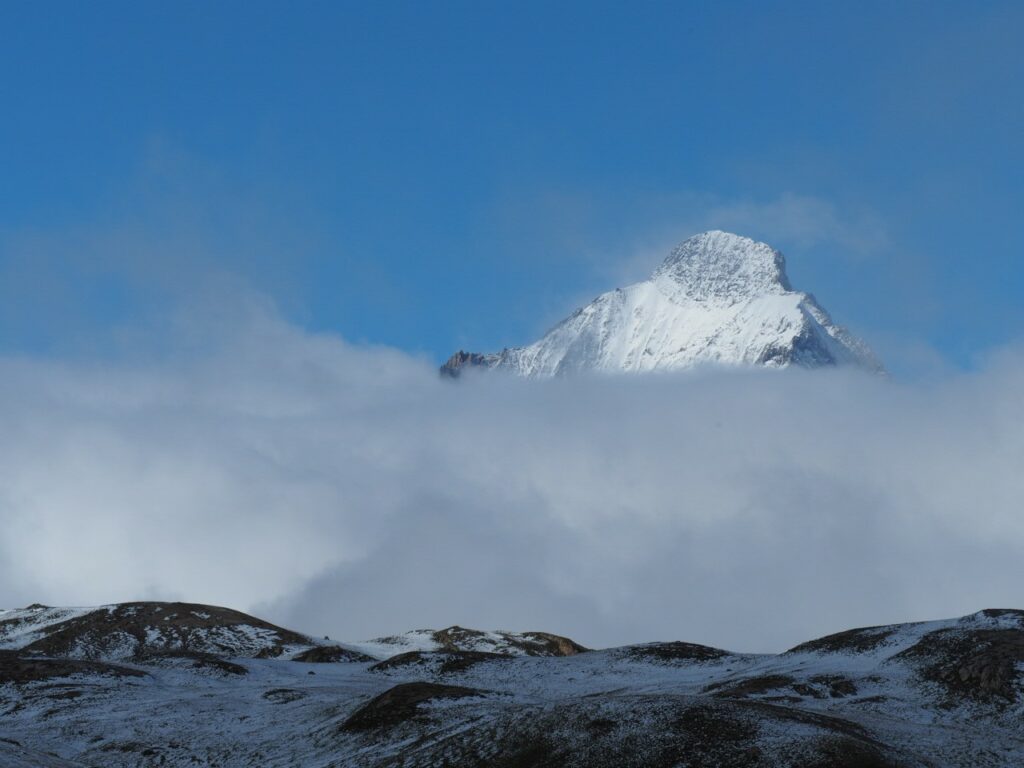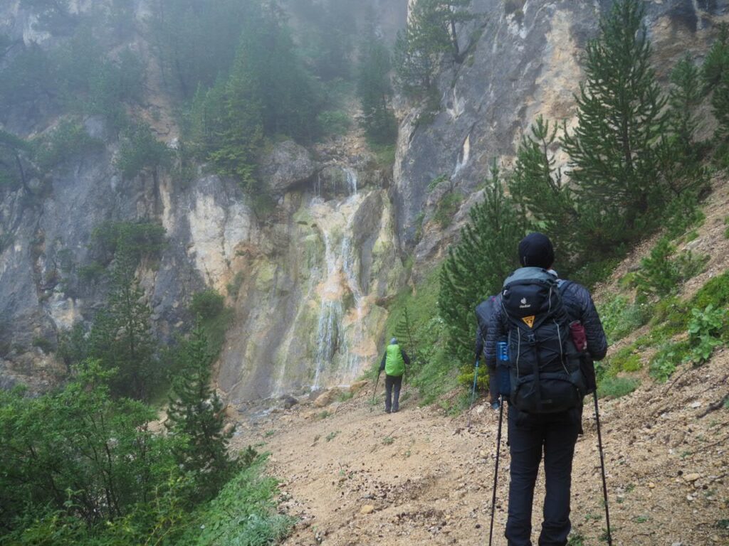 Wir bleiben als gut funktionierende und sich gut verstehende Gruppe zusammen und steigen gemeinsam ins Tal ab. Laut Wetterbericht mussten wir damit rechnen, dass es auch an diesem Vormittag noch regnet, aber wir haben Glück, es bleibt trocken und reißt immer wieder auf. Ein wunderbares Wolkenschauspiel, das in schnellem Wechsel die weißen Berggipfel freigibt und versteckt.