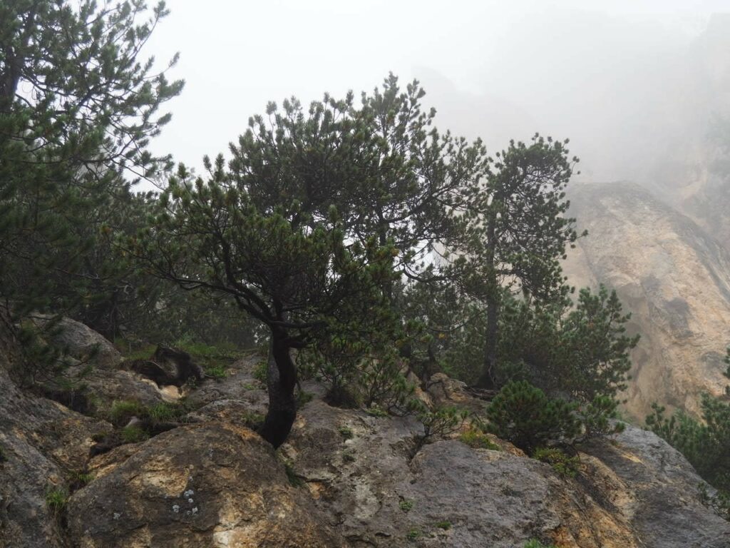 Der Abstieg ist viel reizvoller als wir erwartet hatten – kein langweiliges Straßengelatsche, sondern die Durchquerung sehr unterschiedlicher Vegetationszonen, noch verstärkt durch über-in-unterm Nebel.