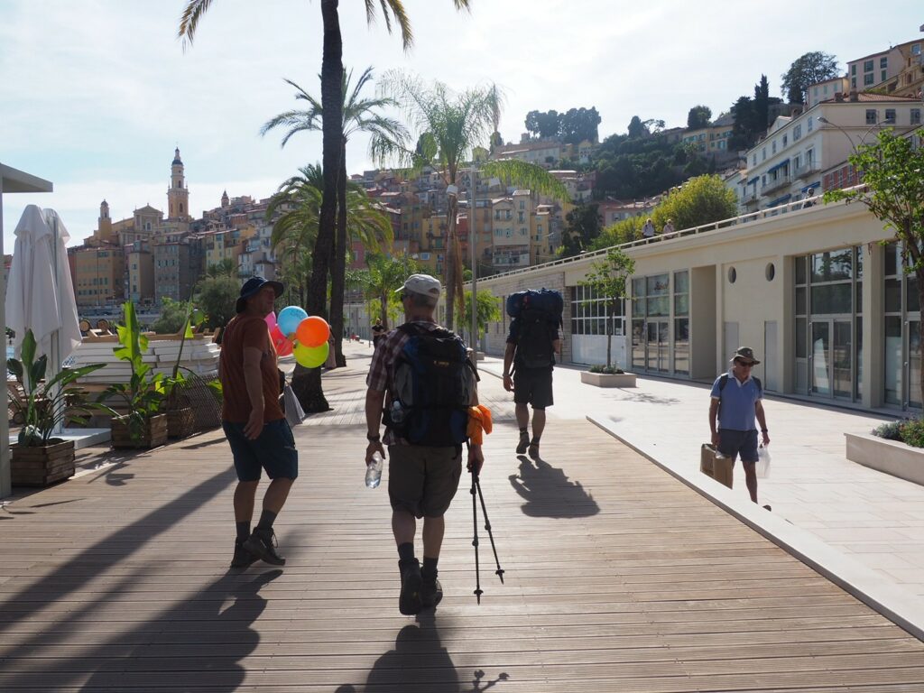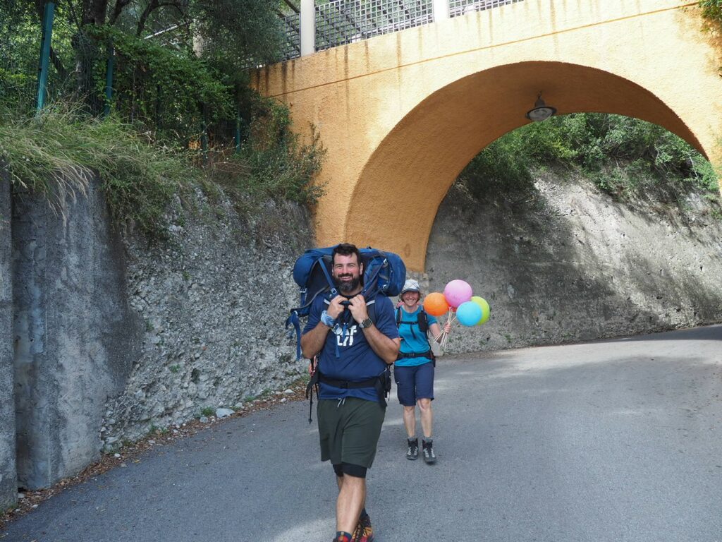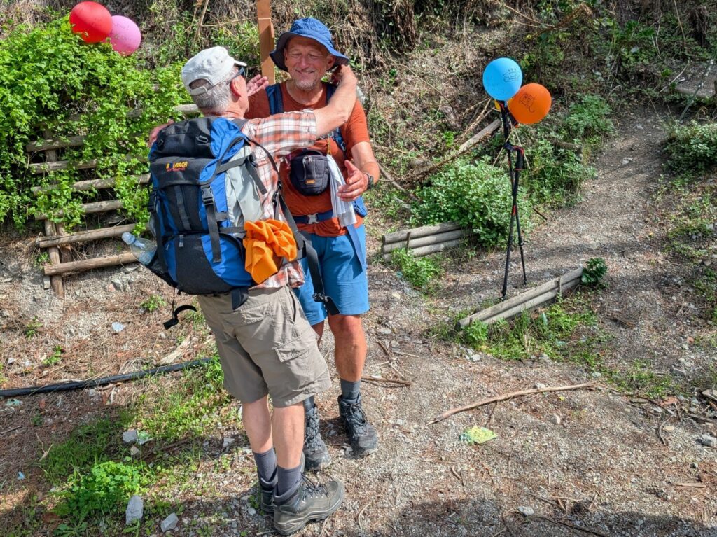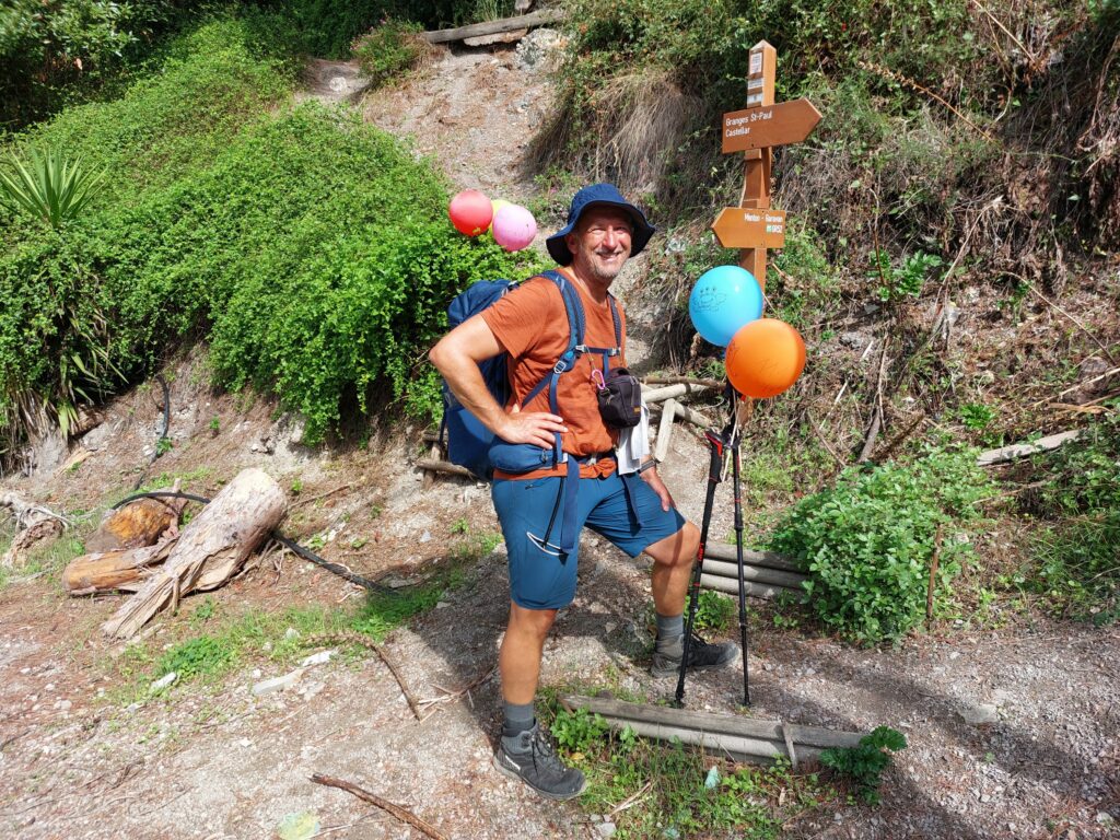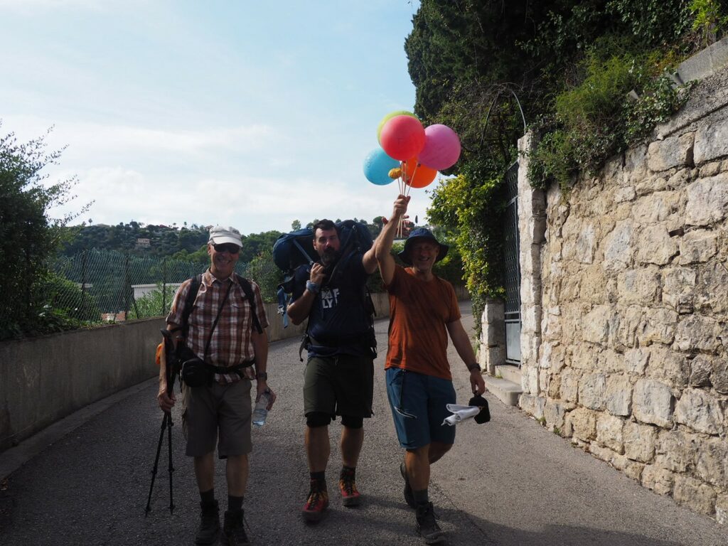 Unser Übernachtungsplatz (im 2. OG)Wir kommen nochmal an die französisch-italienische Grenze. Hier nebendran ist übrigens auch unser Frühstücksplatz.Erster Blick des Tages auf das Ziel. Schon noch ziemlich weit weg …Wie gestern erklimmen wir noch ein Extra-Gipfelchen: Gut für Gipfelbilder und Aussicht. Ja, Jochen schwächelt ein wenig bei der Erklimmung der extrem schwierigen letzten Klettermeter.Schließlich schafft er es doch fürs Vater-Sohn-Bild.… samt Selbstauslöser-Dreier-Selfie.Atemberaubendes Küstenpanorama.Monaco und seine Yachten mal gschwind her gezoomt.😍Sehr nett: Auf dem Abstieg hat jemand einen kleinen Pausenpalatz eingerichtet mit Sirup, Pavillon und Sofa(!)Noch bevor wir bei den ersten Häusern sind: Die Autobahn samt Stau.Hmm, Kindergeburtstag oder was? Aber die Ballons an Wanderstöcken befestigt? Und mein Name steht drauf? Und Alpenbogen steht drauf? Ich bin verwirrt und auch hilfesuchende Blicke zu Cora und Jochen helfen nicht.Und dann kommt der Markus aus dem Gebüsch!!!!! Ist der Kerl hierher gefahren, um uns zu empfangen, auf den letzten Metern zu begleiten und die nächsten Tage zu verbringen. Wahnsinn, verrückt – und so schön. Danke, danke, danke.Da war doch noch was? Die große Klappe von Jochen vor 4 Jahren, dass er mir am letzten Tag den Rucksack trägt, wenn ich wirklich so weit komme?Gesagt, getan. Ein Muli könnte es nicht besser.So kann ich locker flockig mit meinen Luftballons nach unten schlendern.Schnurstracks aufs Meer zu.Auf der Strandpromenade auf der Suche nach der besten Badestelle.Gefunden 😃Danach ein Bier …… und abends Schlemmen auf unserer großzügigen Terrasse.Am Tag darauf finden wir die offizielle Abschlussplakette des französischen GR5, die wir einfach mal als Symbol für den Alpenbogen-Abschluss umwidmen.