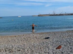 Um 15:30 Uhr ist es geschafft: Ich stürze mich am Stadtstrand von Menton in die noch warmen Fluten des Mittelmeers.