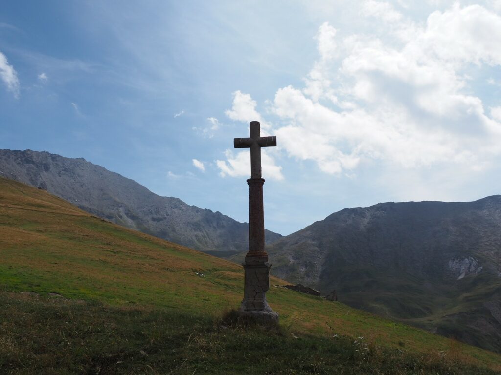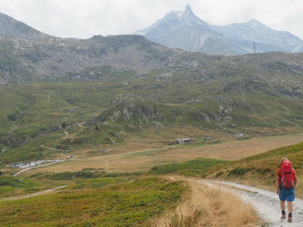 Vor dem „Hotel la Turra“, also exakt an der Stelle des letztjährigen Abschlusses sind wir aus dem Bus gestiegen und pünktlich um halb 10 gestartet. Zunächst ging’s gemütlich 2 km talauswärts – gut zum Warmlaufen. Denn dann kam der teilweise ziemlich steil angelegte Anstieg über 1.380 Hm zum 2.638 m hohen Col de Sollières. Zum Glück liegen die ersten 2/3 im Wald, oben sind dann freie Almwiesen. Dadurch, dass es ab Mittag etwas zuzog und ein leichtes Lüftchen wehte, war die Wärme trotzdem erträglich. Anstrengend war’s halt gleich am ersten Tag, aber immerhin ohne ganz großes Leiden.