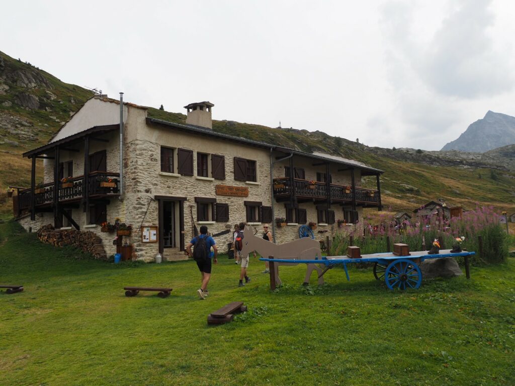 Das Refuge de Petit Mont-Cenis ist dann doch nicht ganz so abgeschieden, wie es die Homepage angkündigt: Ein großer Parkplatz wenige hundert Meter daneben lädt die Tagesgäste ein und die Gartengestaltung mit Plastikblumen in alten Bergschuhen sind auch so-la-la. Aber wenn die Tagesgäste dann weg sind, wird es heimelig – und das mit einem tollen 4-gängigen Abendessen. (ÜN mit HP kostet hier übrigens 40€). Für die Schlafzimmerbeleuchtung werden wir mit tragbaren Lampen ausgestattet.